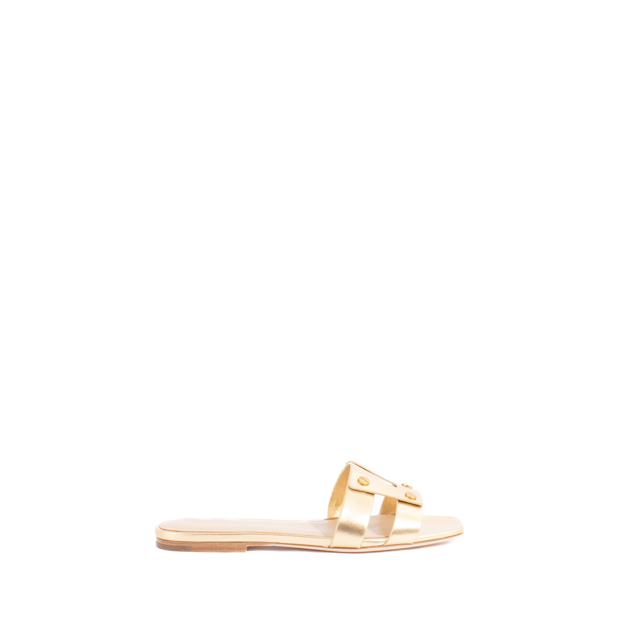 The quintessential sandal every wardrobe needs. Expertly crafted from gold metallic leather, the Via open-toe slide features a minimal multi-strap silhouette, punctuated with gold hardware. Equal parts polished and effortless, it’s the shoe that goes with everything—day to night, week to weekend.
